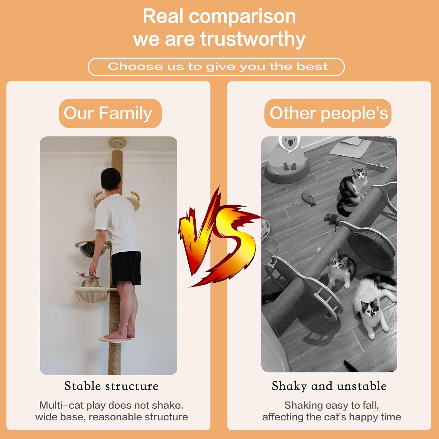- Premium Materials & Safe Construction Crafted from CARB-certified pine wood, durable PVC, and natural sisal rope, this cat tree is scratch-resistant and non-toxic for worry-free play. Breathable plush fabric and easy-to-clean surfaces ensure long-lasting use, while rounded edges protect both cats and furniture from scratches.