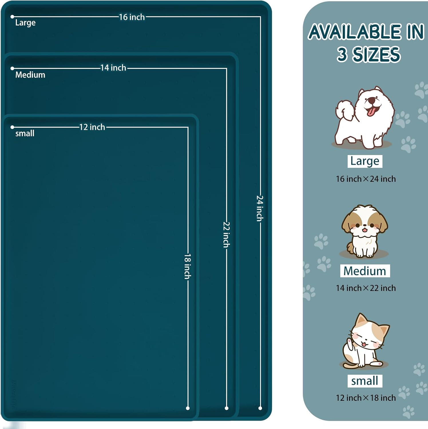 - Raised Edge Design: The food mat for cat bowls, dog bowl mats for food and water and boot tray measure 24" x 16" with a 0.6-inch raised edge that helps to keep all the mess contained on the small rubber mat for dog bowls. As a barrier, the waterproof dog mat for food and water, pet feeding mats for dog bowls and cat mats for food and water are perfect for pets who eat with enthusiasm or like to play with their food, effectively preventing pets from eating food that has been soiled by the floor