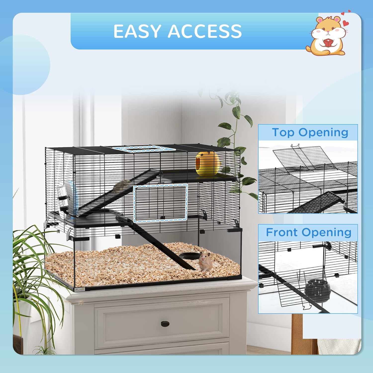 PawHut Large Hamster Cage with Deep Tempered Glass Bottom, 3 Tiers Hamster Tank with Running Wheel, Hut, Water Bottle, Dish, Rat Cage for Syrian, Dwarf, Gerbils, Mouse, 31" x 19" x 21.5", Black