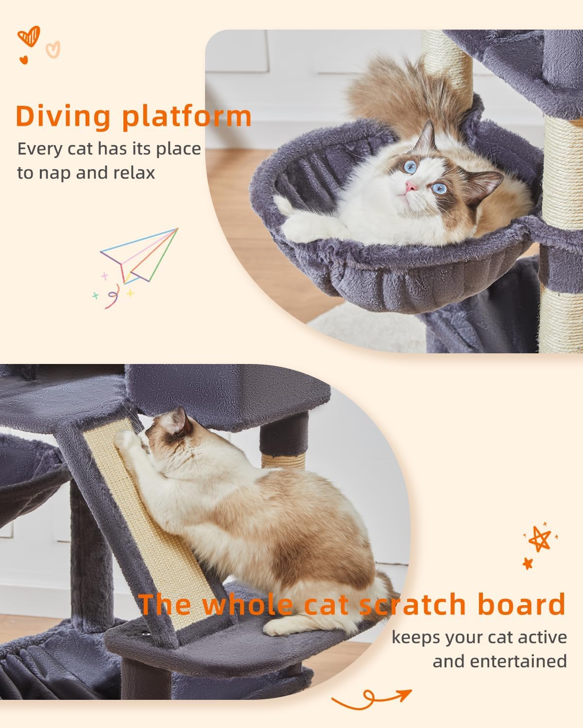 - 1.All-in-one design: There are 5 floors with 2 soft tops, 1 spacious cat apartment, 1 sisal ramp, 1 hammock and 1 hanging basket, natural sisal scratching posts and skin-friendly plush, and a multi-functional cat tree that attracts cats to play and rest.