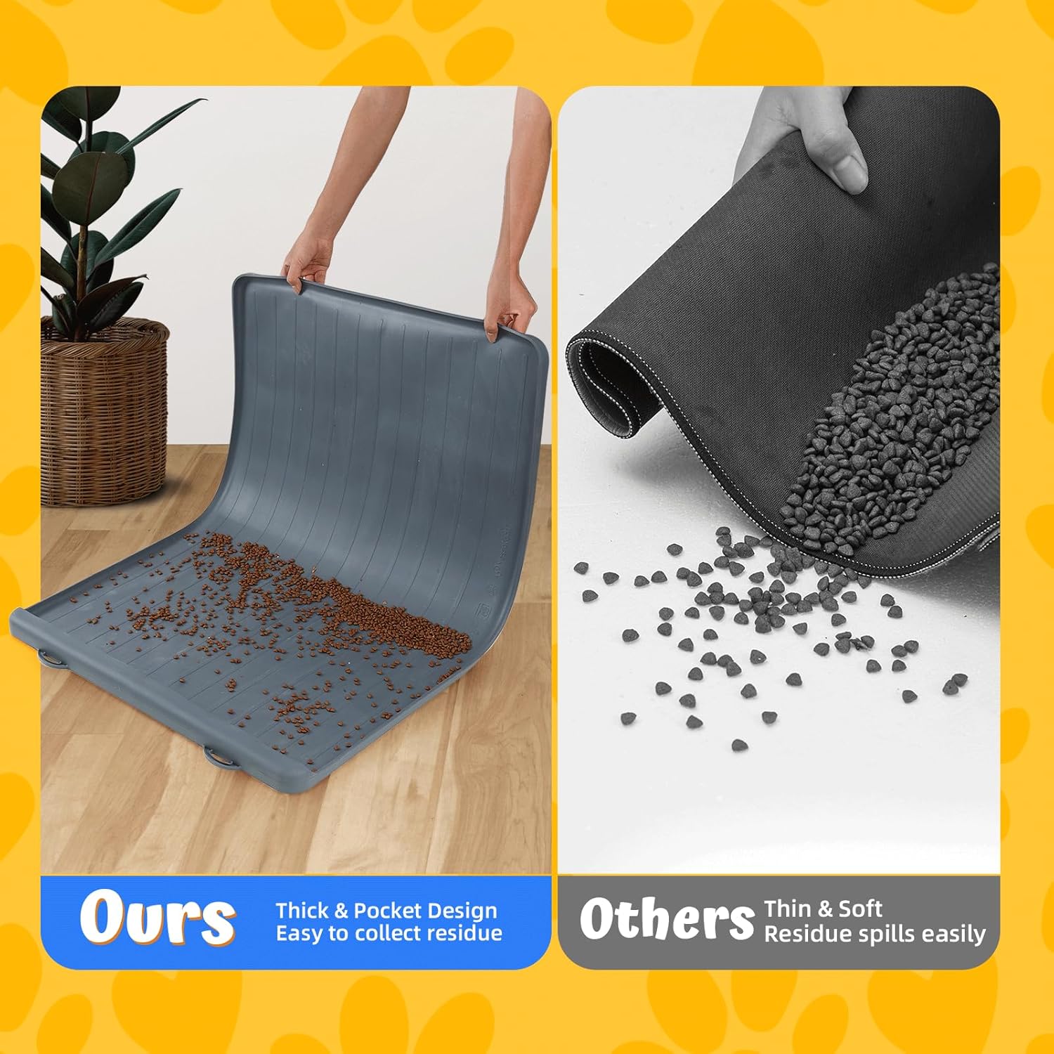 - FITS ALL PETS & ALL TYPES OF BOWLS: This dog or cat food mat comes in a range of sizes and is designed to accommodate pets of all sizes, including puppies, adult dogs, and even large dogs. Our dog food mats are available in a variety of colors and will complement any home decor. It's perfect for use with all types of pet bowls, whether you have a cat fountain, raised feed, or automatic feed. In addition, it can also be used under the cat litter box to keep the floor tidy.