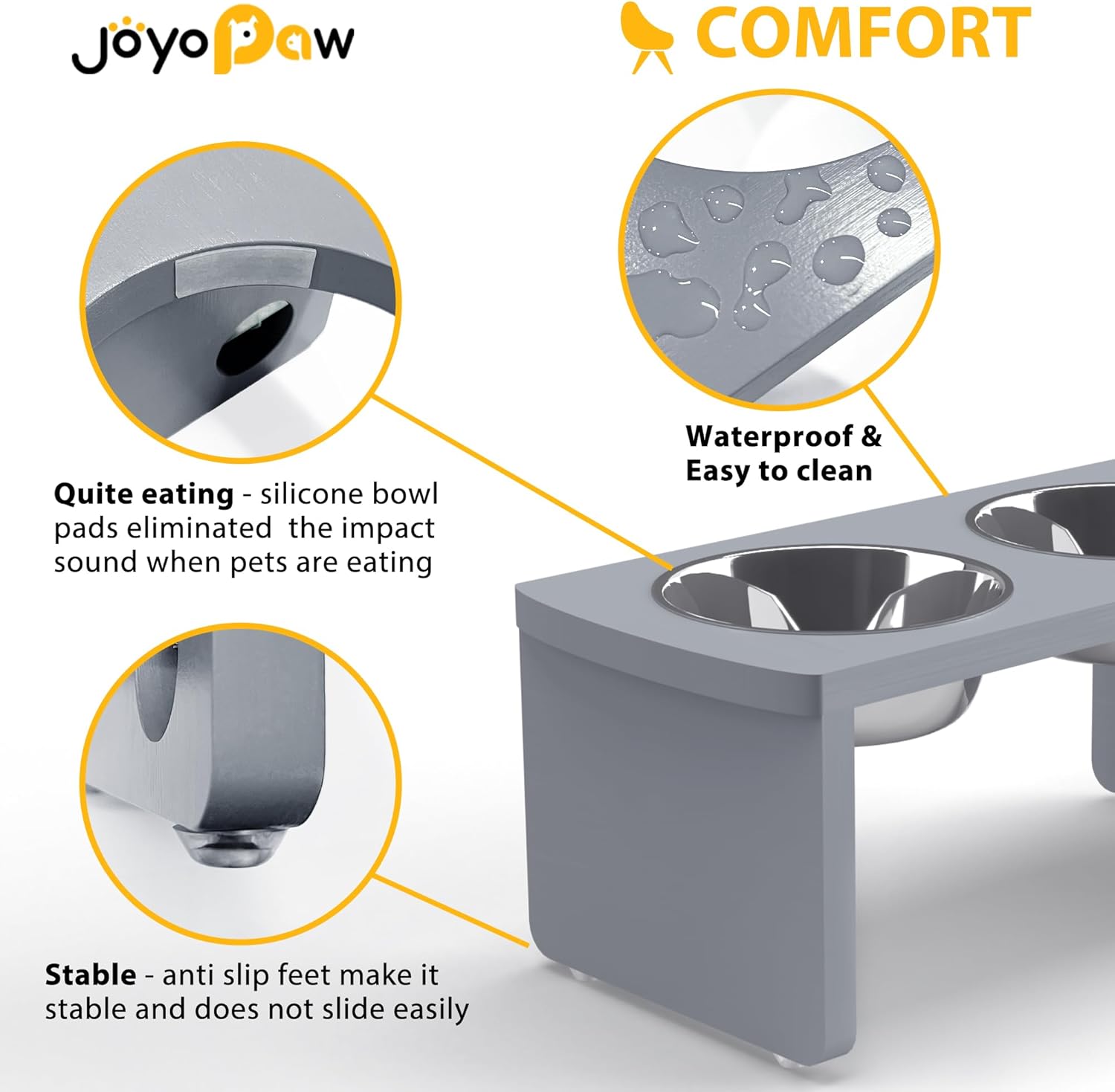 - IMPROVE HEALTH STATUS? JoyoPaw bamboo dog food stand provide ease of access to food and water which help to reduce bloating and neck strain in dogs. Encourage effective digestion and avoid joint pressure to protect your adorable friend.