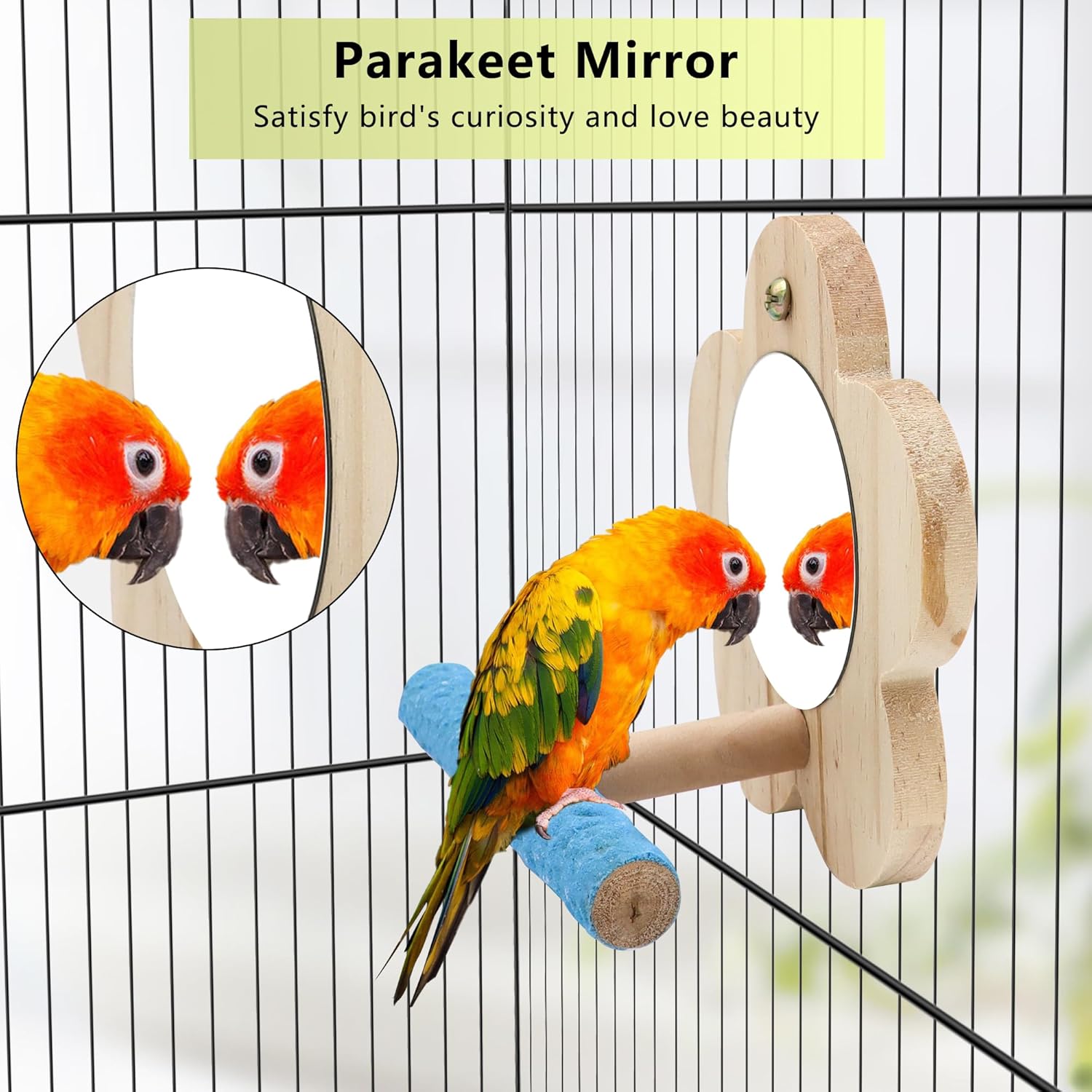 - Natural Wood Bird Perch--Perch stand with bird cage mirror is made of natural wood,resistant to wear and bites,safe for the pets.
