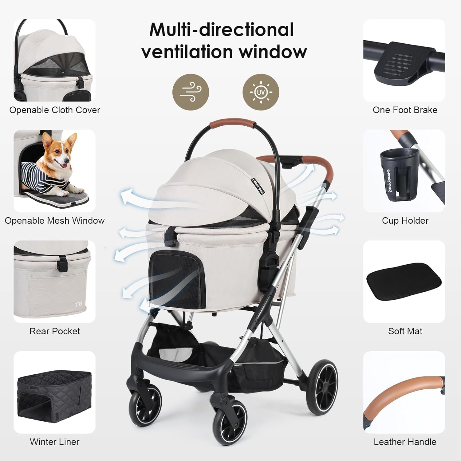 - Premium Durable Materials: The T6 pet stroller features scratch-resistant polymer fabric and a lightweight yet sturdy aluminum alloy frame, combining durability with sleek design. Perfect for active pets who love to chew or scratch!
