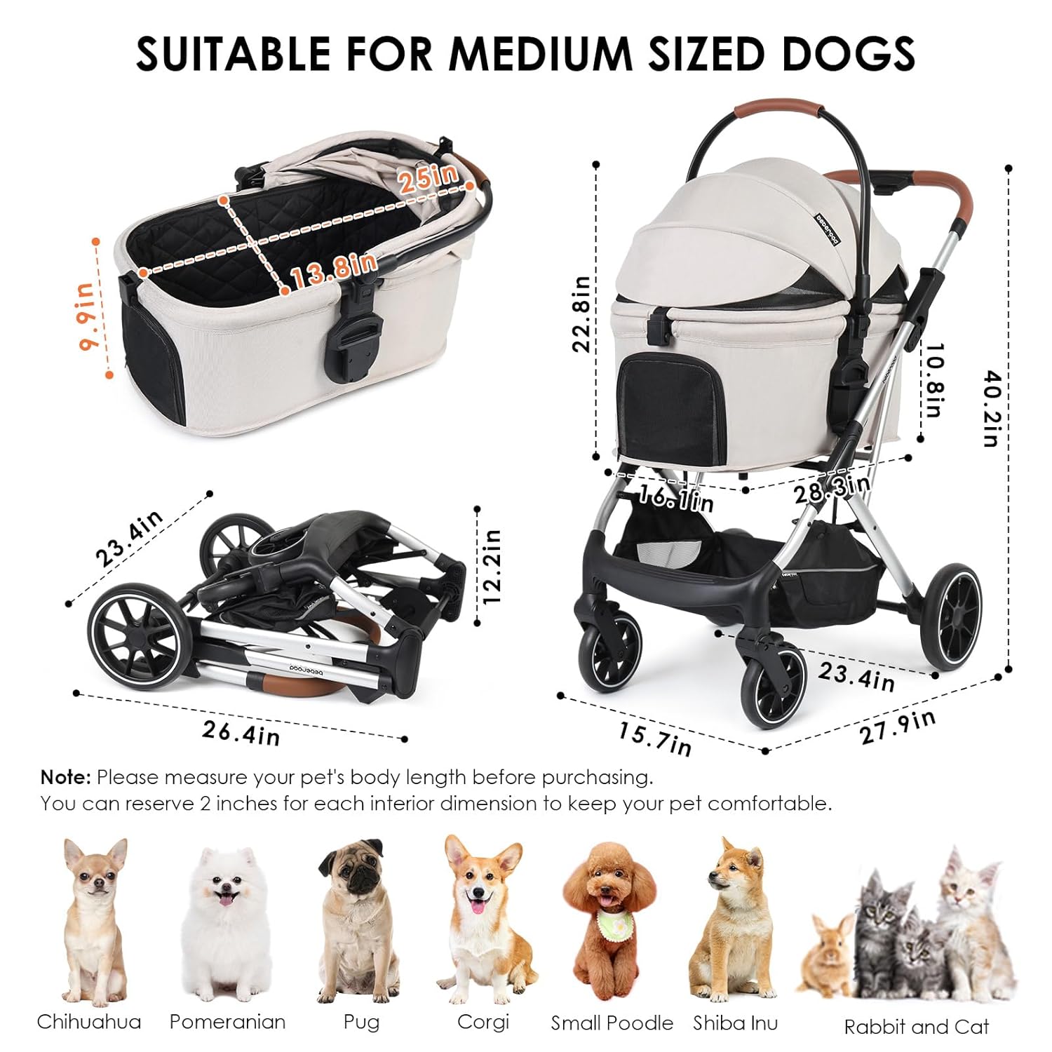 T6 Luxury Pet Stroller for Medium Dogs Up to 66lbs or 2 Small Pets – 3-in-1 Dog & Cat Stroller with Removable Carrier, Foldable & Lightweight (Beige)
