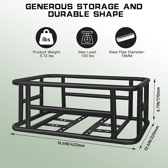- 𝗦𝘂𝗽𝗲𝗿 𝗟𝗮𝗿𝗴𝗲 𝗦𝗽𝗮𝗰𝗲: The dimension of the basket is 16.6 x 12.6 x 6.7 inches, which can support a weight of 100lbs. Perfect for carrying backpacks,pets,daily shopping, or as a delivery bike basket.