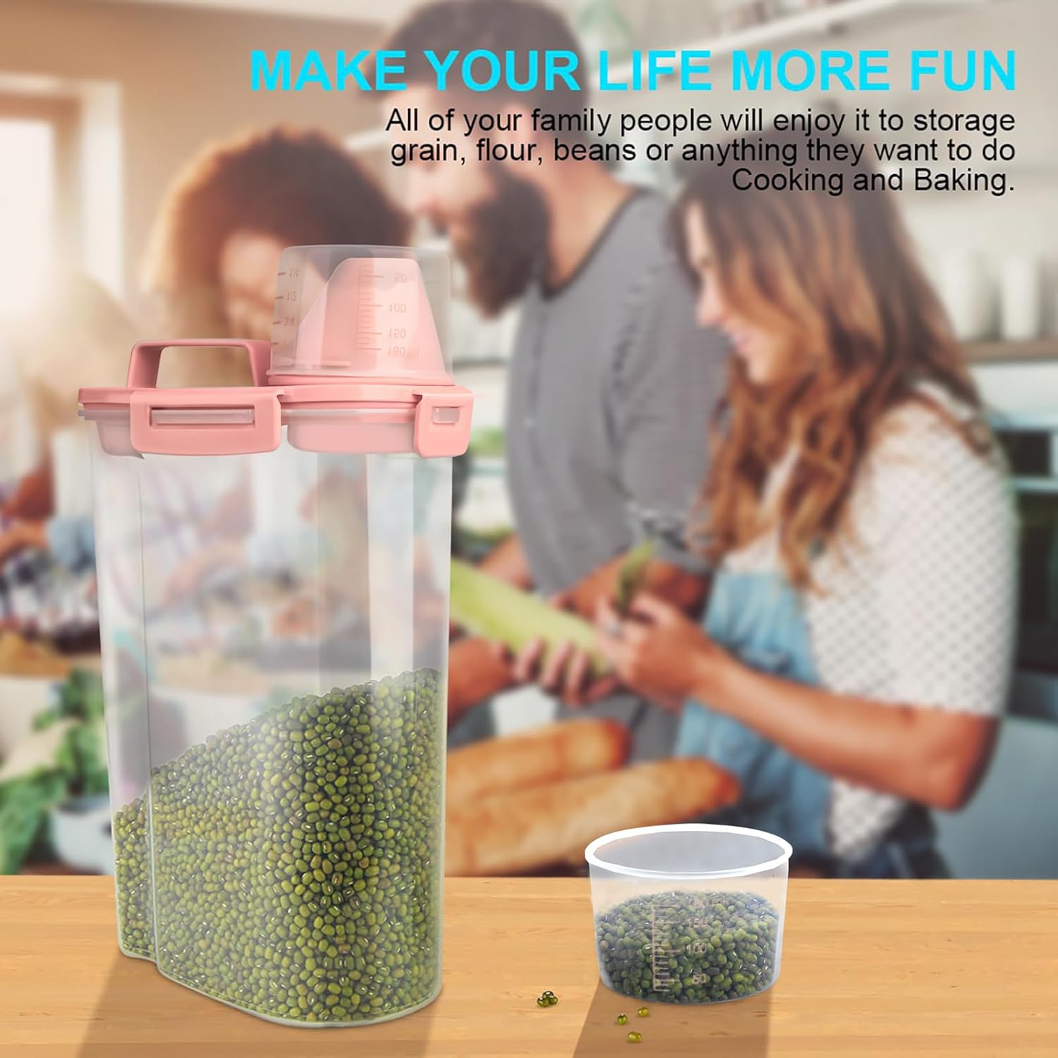 - CLEAR and AIRTIGHT CONTAINERS: it's a really clear plastic container. You can identify the contents without opening them. 4-sided locking lid with silicone seal.It seals really well so you don't need to worry that your cereal goes stales. Measuring cup can screw on over the pour spout. It also can keep out of mice, rats, insects and other pests away