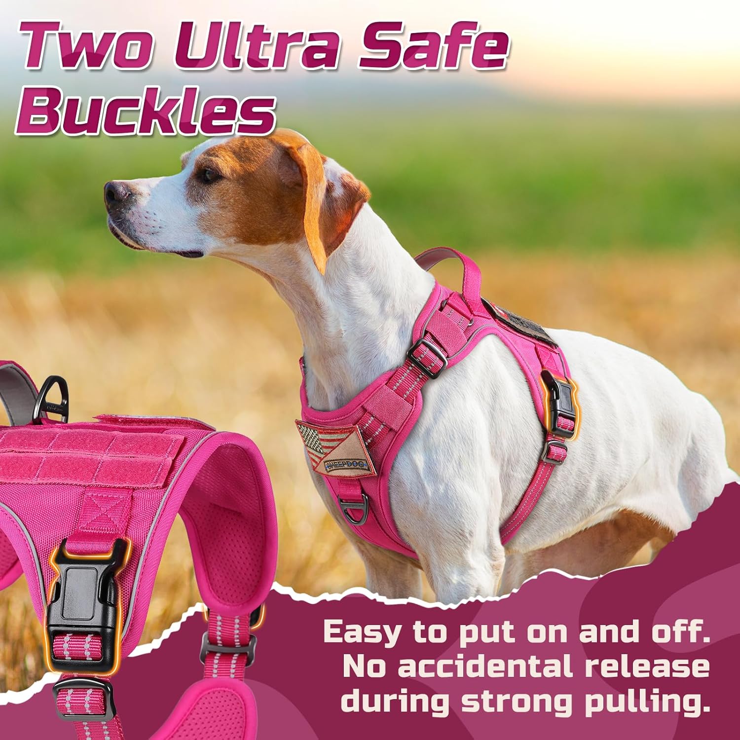 - Easy to Adjust & Wear: The tactical dog harness features 4 convenient adjustment points (2 Shoulder, 2 Chest) to ensure a snug fit for dogs of all sizes. Two quick-release buckles are designed not only for easy on and off, but also can withstand great pulling force, providing security for training, hunting, walking, and any other occasions