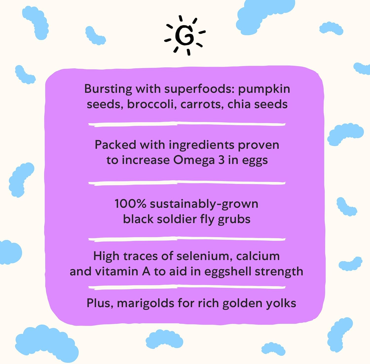 - Sustainably Grown and Oven-Dried: Every harvest of our black soldier fly grubs for chickens is oven-dried for our fluffy ones to enjoy. They are sustainably grown and fed on a wholesome diet of fruits, veggies, and grains. Our chicken supplement ingredients are completely natural and free from any sprays or additives. It's free of soy, corn, fish, and low-value grains.