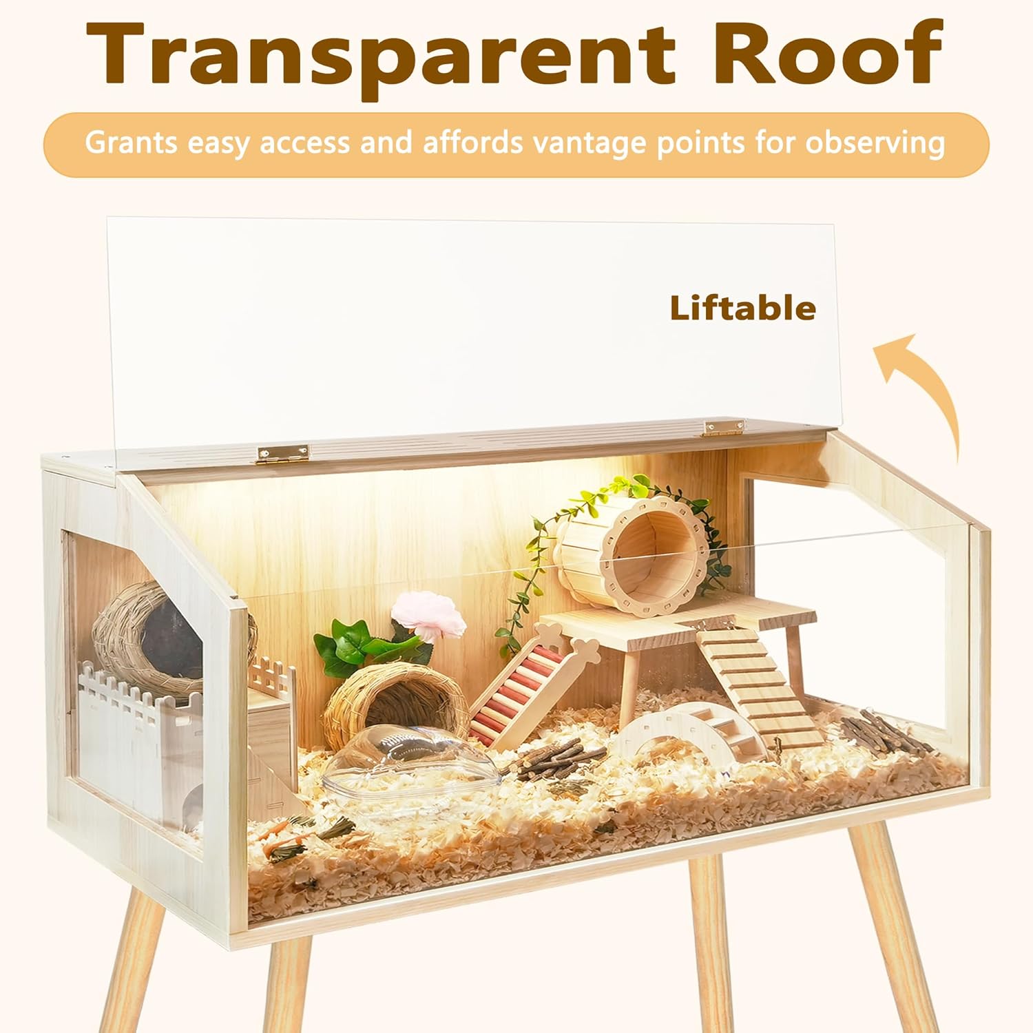 - 【High-Quality Materials】Available in 4 sizes ranging from 24 to 48 inches in length, with 24 inches legs height, please refer to picture 3 for size information. Crafted from durable, high-density natural wood treated with a rot-resistant, waterproof coating, our cage ensures longevity and aesthetic appeal. Transparent acrylic panels provide a clear view of your cherished hamsters' activities. An additional acrylic sheet on the cage bottom prevents moisture buildup, simplifying cleaning tasks.