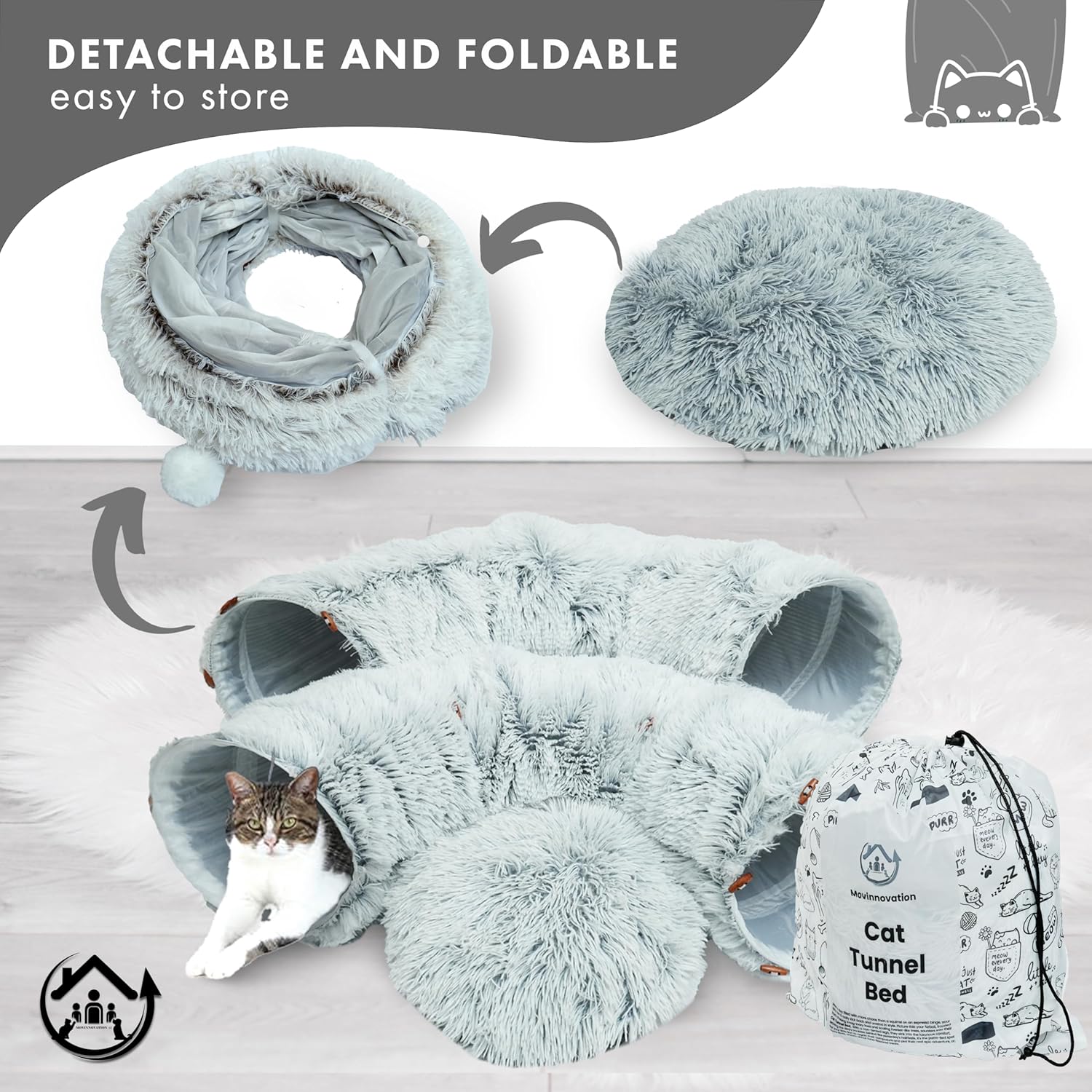 Large Cat Tunnel Bed for Indoor Cats Warm Fluffy Plush Cat Cave Tunnel Bed Collapsible, Washable, 3 Way and Multifunctional with Dangling Balls for Cats, Kittens and Rabbits- Gray