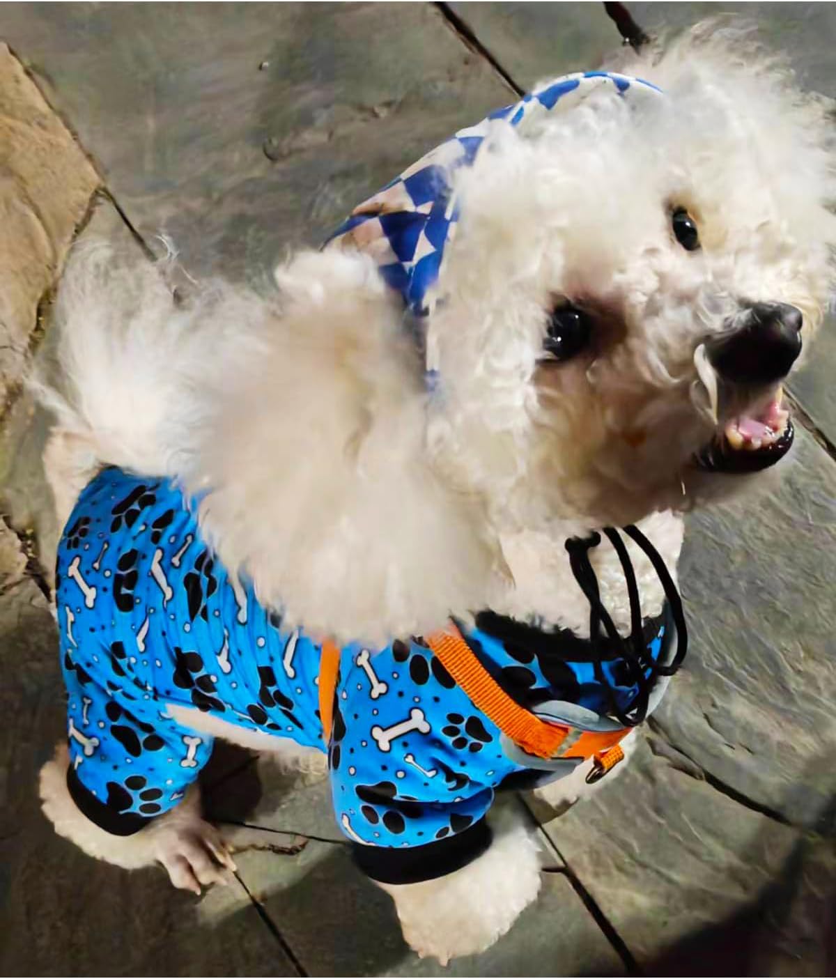- Paw&Bone Prints Dog PJs: This dog clothes set contains 4 pieces cute dog fleece pajamas with dog paw and bone designs. There are 4 colors to choose: pink purple/blue/red/black, suitable for small medium doggies,male and female. It is adorable and eye-catching when your puppies wear it. They are good choice for the multi pet families.