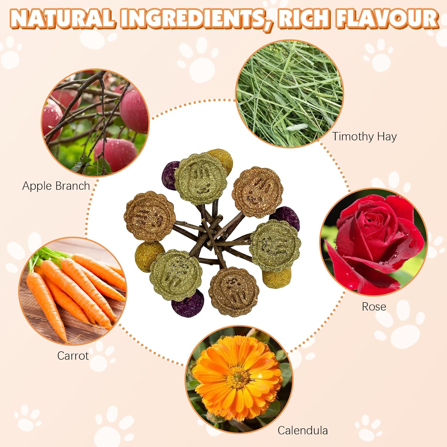 - š¾ [Rich in Flavour]: Rabbit chew sticks package includes 3 x rose lollipops, 3 x calendula lollipops, 3 x timothy hay lollipops, 3 x bunny pattern timothy hay lollipops and 3 x bunny pattern carrot lollipops.