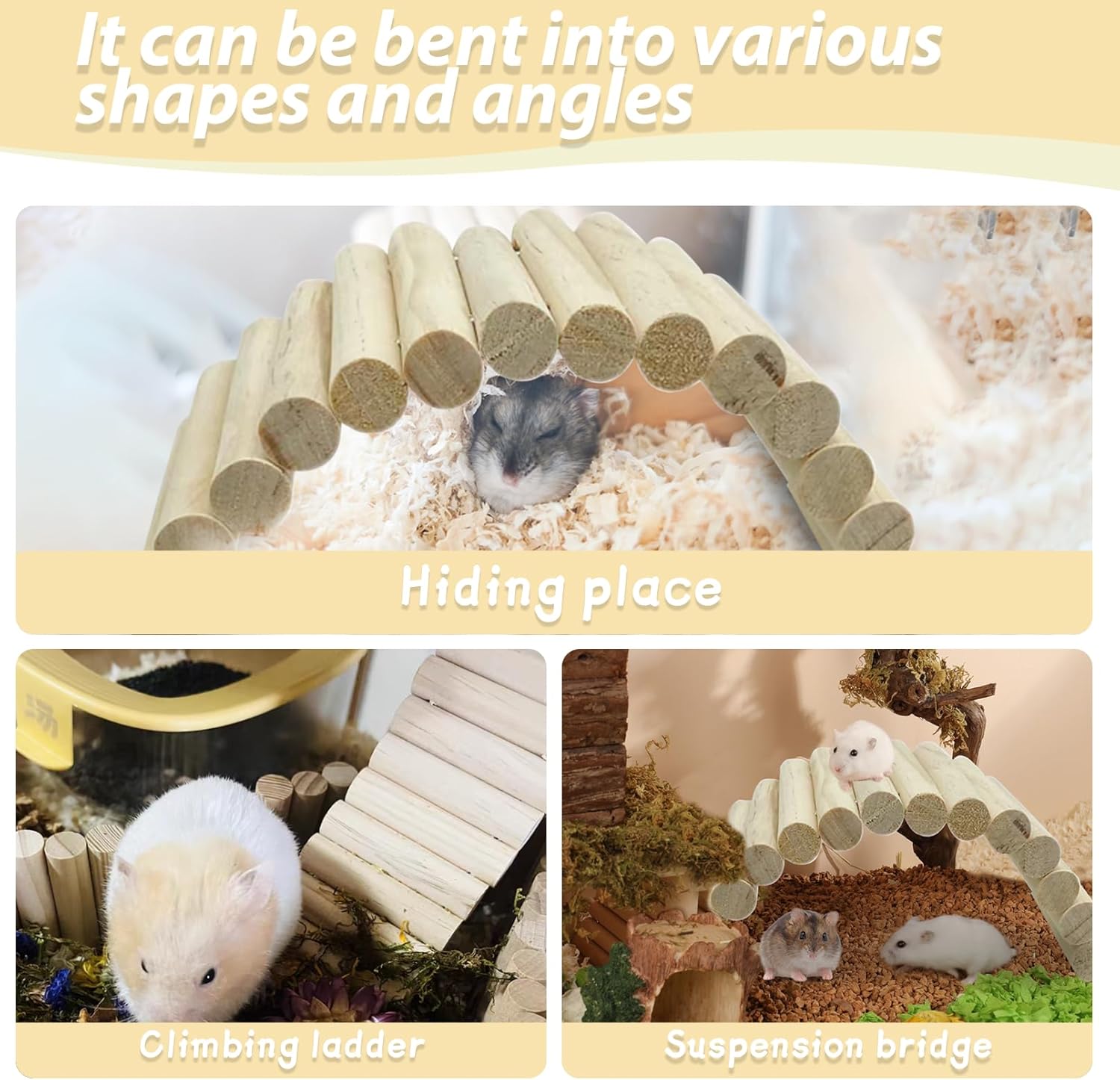 - Enhance Your Pet's Habitat: We stylishly upgrade your pet's cage with our rat toys, featuring the eye-catching wooden ladder bridge. Create a comfortable and engaging environment for your furry friends, making their habitat feel more like home