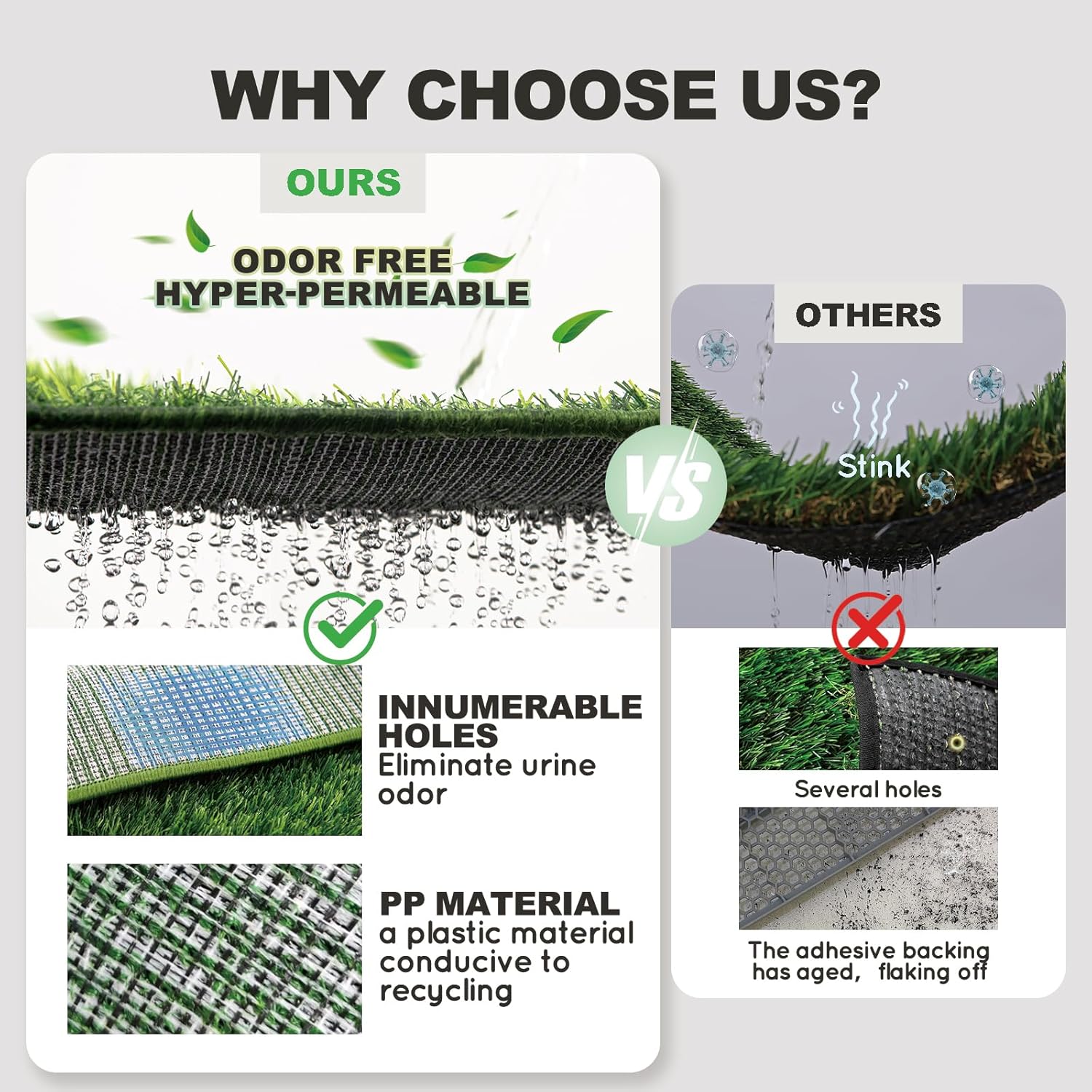 - Sturdy Grate : The plastic grate layer keeps the dog turf separated from the pee pad. The holes are well spaced so the pee goes straight through to the pee pad. The grate is a sturdy, heavy duty plastic.