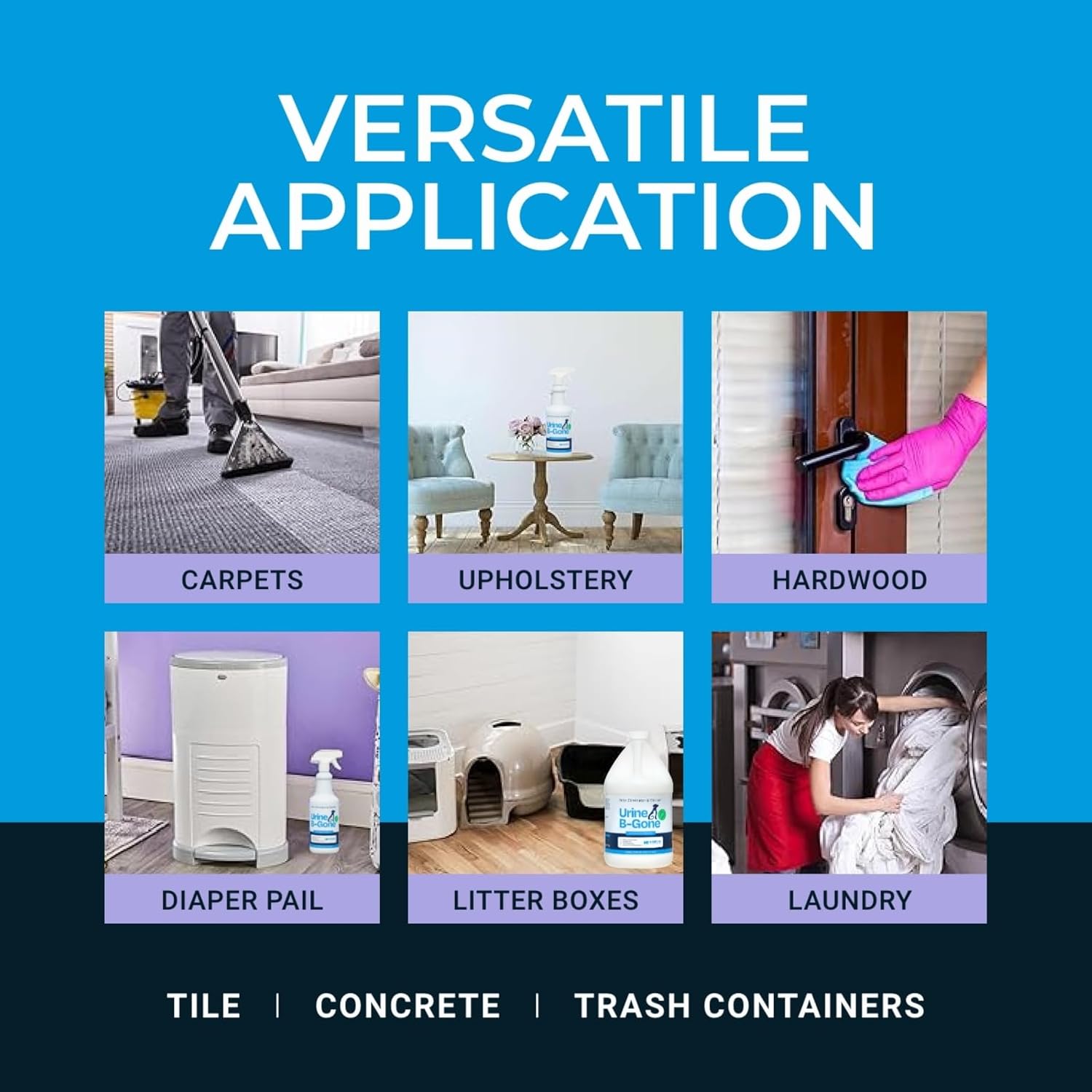 - Versatile Cleaning Solution: Beyond pet stains, Urine B-Gone is ideal for a variety of applications; Use it in your laundry to pre-spray soiled areas or even in drains, urinals, and toilets; This all-in-one cleaner & odor remover makes tackling tough stains and odors simple and efficient