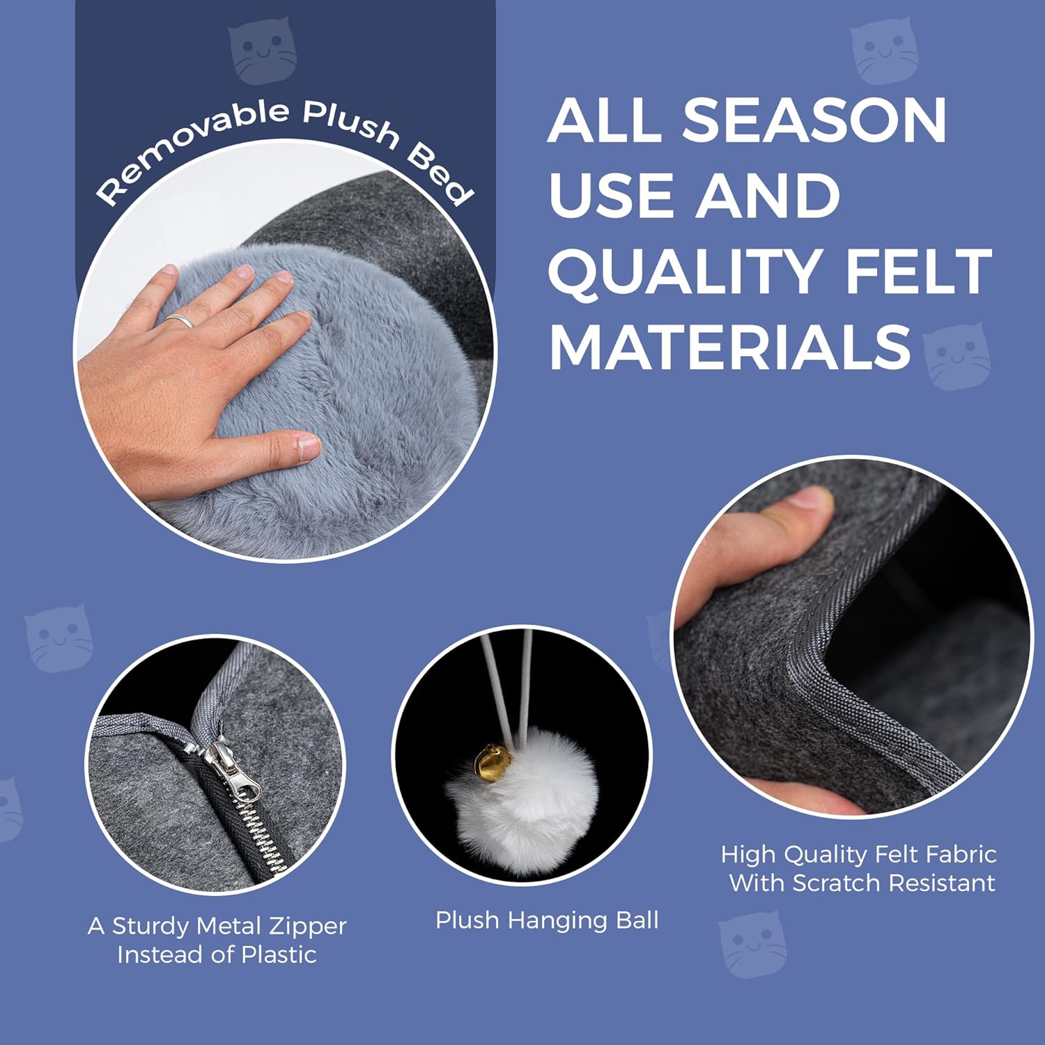 - PLAYFUL AND PRACTICAL – More than just a bed, our cat tunnel bed plush interior and enclosed design create a secure and safe little hideaway for anxious or shy cats to relax and play. The removable cushion allows for easy cleaning, while its compact size and dark gray color design make it perfect for any home