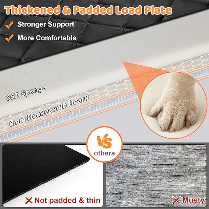 - High Barrier Design: This dog back seat extender has a 26-inch high front barrier. It can effectively prevent large dogs from jumping into the front seat, protect your pets in case of sudden braking and prevent distractions while driving