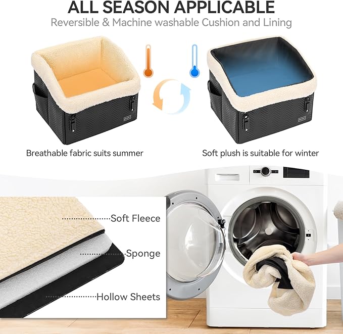 - [Dual-Sided Comfort Cushion] The small dog car seat features a unique cushion design with one side soft fleece and the other durable Oxford cloth, it meets different weather and pet needs. The cushion is detachable and washable. With comfortable fleece-lined edges, the dog booster car seat offers your pet a first-class comfort experience during rides