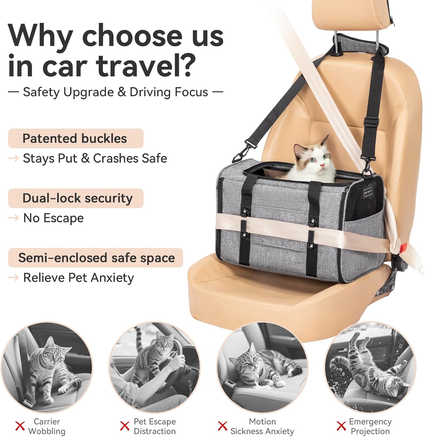 - Patented Safety Design: Featuring patented buckles and an adjustable clip-on harness, this cat car carrier ensures stability during car travel. It also includes an anti-loss safety rope and a lockable zipper to prevent pets from jumping out and distracting the driver