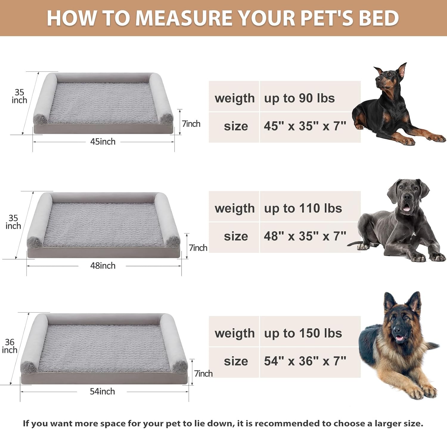 - DIMENSIONS (DOG BEDS FOR MEDIUM DOGS): jumber plus dog bed 54" x 36" x 7" (3.5" bolstered side ) for medium and large dogs up to 150 lbs. For dogs that like to roll around, sizing up will be more comfortable.