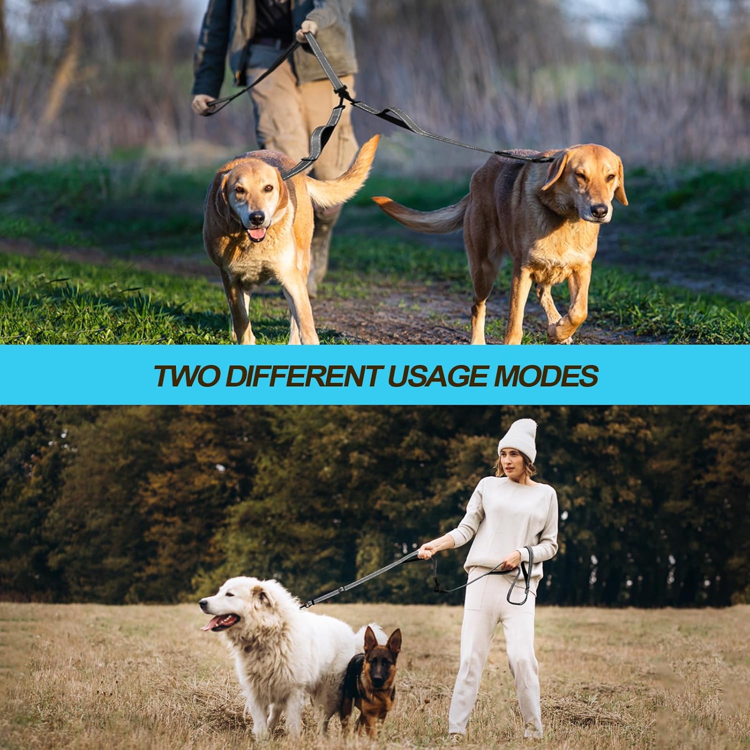 - 4 Comfortable Padded Handles: No more burned hands with 4 soft padded handles, which bring ultimate comfort and let you free up one hand while using this split leash for walking 2 dogs