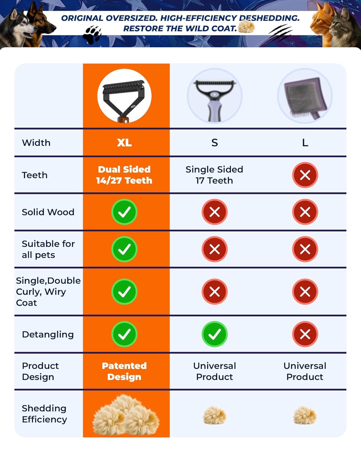 Extra Large 2-Sided Undercoat Rake for Dogs & Cats, Dog Brush for Shedding Remove Mats, Dematting Comb, Safe&Gentle Grooming Brush for German Shepherds Medium to Long-Haired Pets, Wooden Handle(Black)
