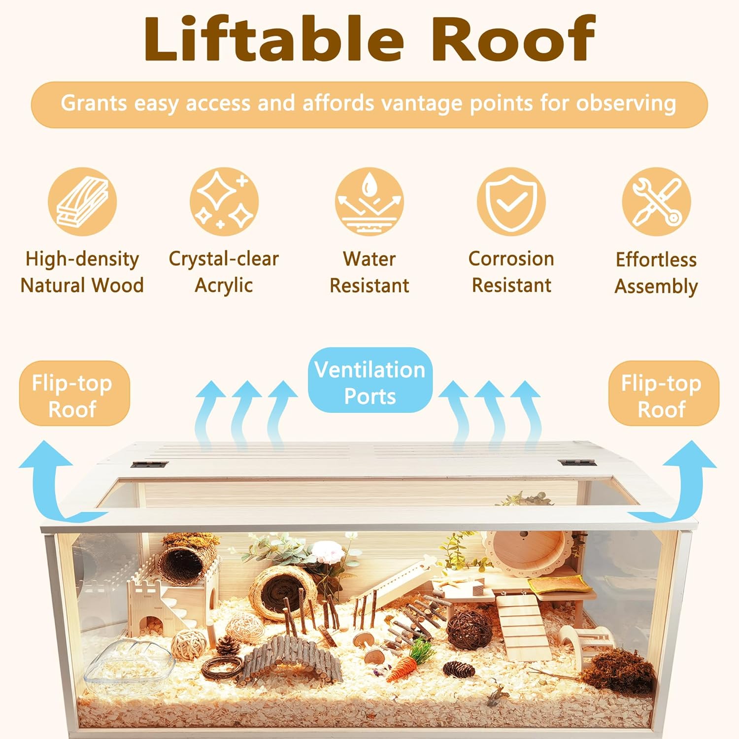 Prolee Hamster Cage Wooden Chew Proof, Extra Large Mice and Rat Habitat Openable Top with Acrylic Sheets Solid Built Small Animal Cage with Leg Stands, 48 Inch Long
