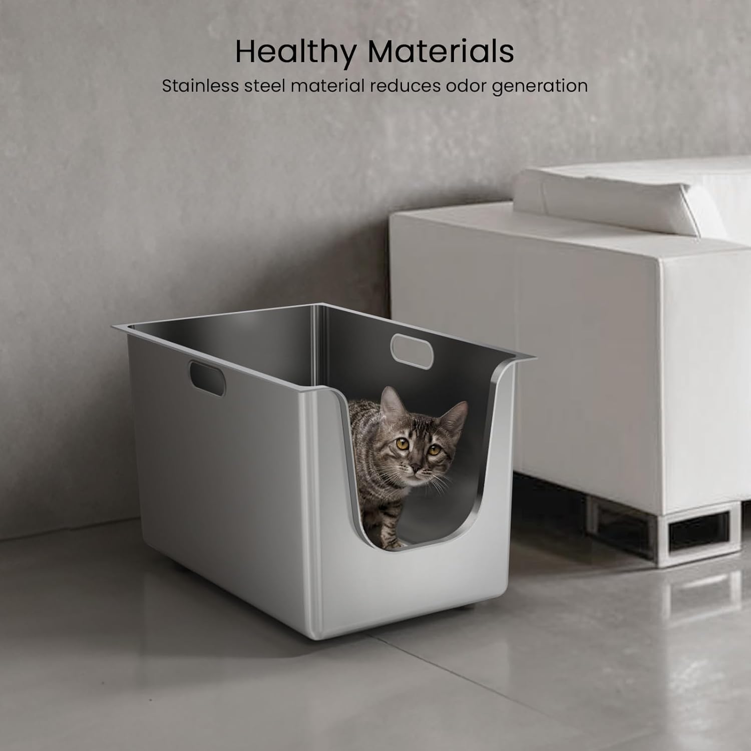 - All Metal Litter Box: Crafted from full stainless steel, rust-resistant, odor-free and non-stick, this high sided litter box boasts 13.7" high sides deep litter box design that prevents cats from kicking litter out of the cat box. One-Piece Stainless Steel cat litter box large for big cats effectively keeps cat urine from leaking and is friendly for high peeing cat