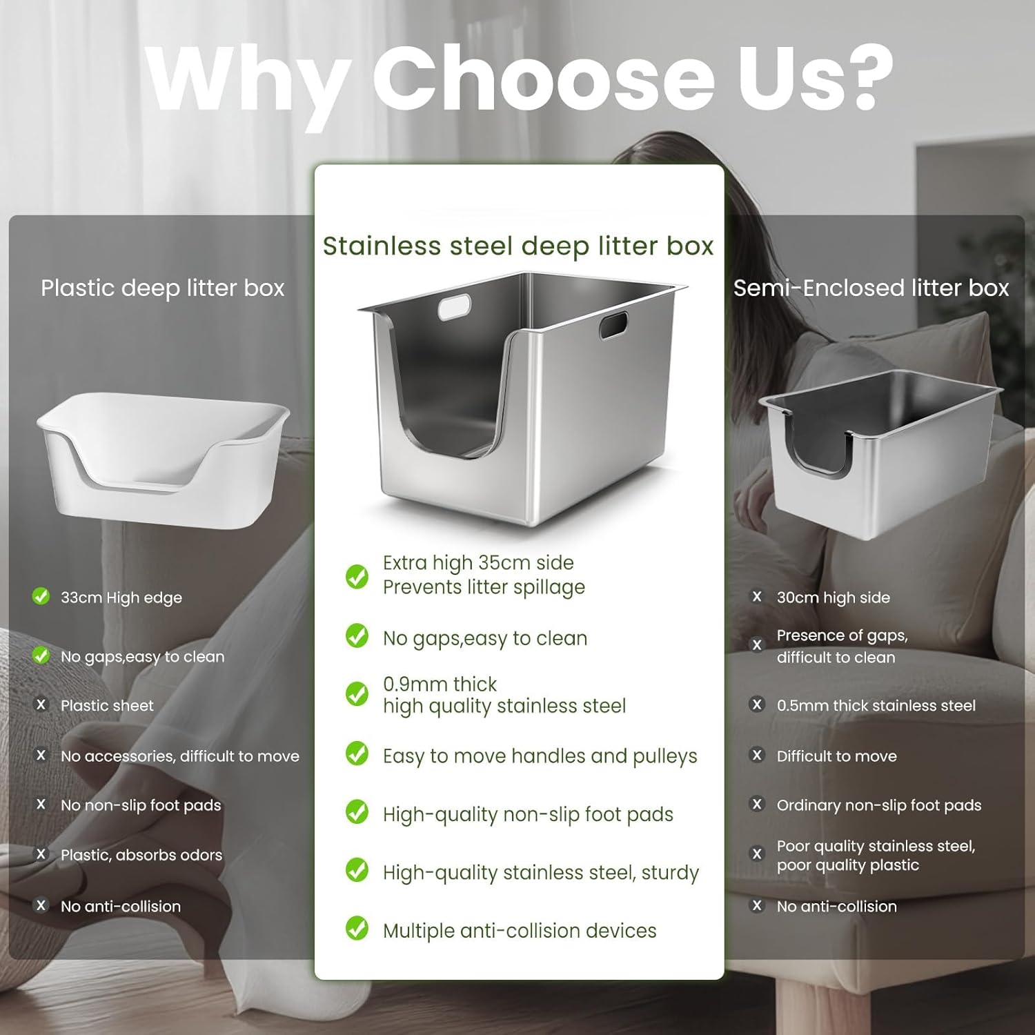 - Conveniently Mobile & Easy-Lift Handles: Move your cat litter pan with ease, thanks to the rubber-coated portable handles on both sides provide a comfortable grip. The sliding wheels make move effortless. Plus, the included non-slip pad ensures the deep stainless steel litter box stays firmly in place, providing stability and comfort for your pets