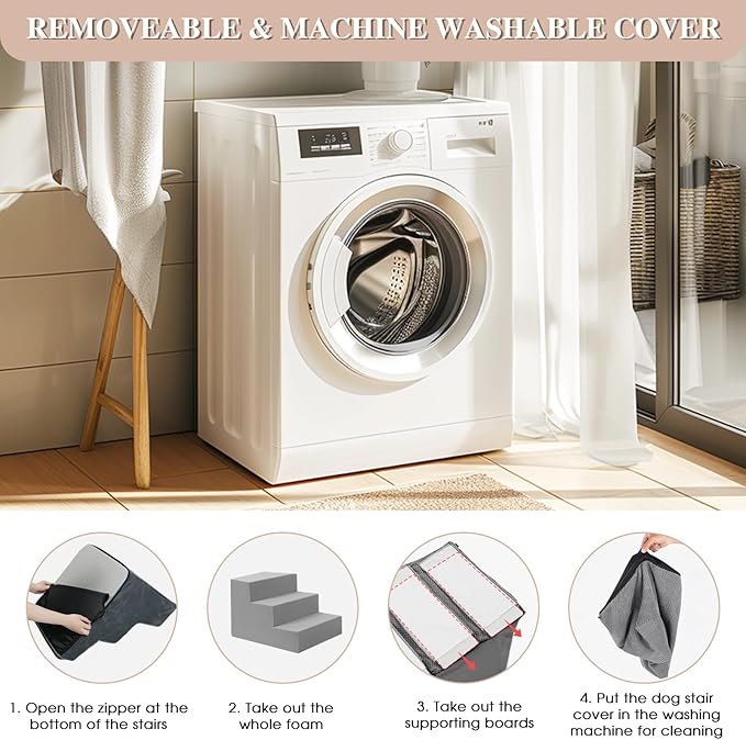- 【ENHANCED STABILITY】GGIB dog stairs improve a new design with supporting boards, added between the foam stairs and the removable cover. They are fixed inside the cover. Pets can step on more stable and supportive stairs surface, preventing them from slipping when moving quickly.
