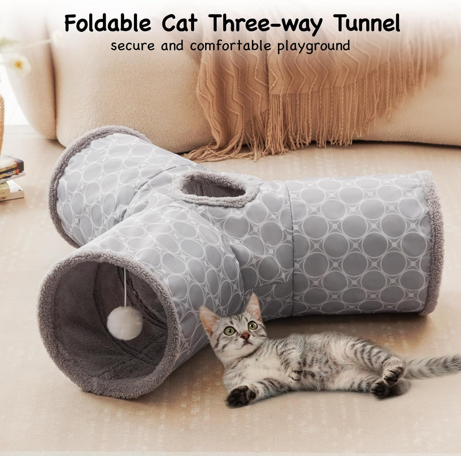 Tempcore Pet Cat Tunnel Tube Cat Toys 3 Way Collapsible, Cat Tunnels for Indoor Cats Fleece-Lined in for Warmth,Kitty Tunnel Bored Pet Toys Peek Hole Toy Ball Cat, Puppy, Kitten, Geometry Grey