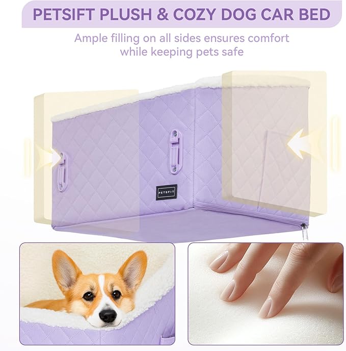 PETSFIT Dog Booster Car Seat, Soft Foam Cat Car Seat with Patented Safety Buckles, Storage Pockets and Detachable Clip-On Safety Leash, Dog Car Seats for Small Dogs Under 30 LBS (Purple)