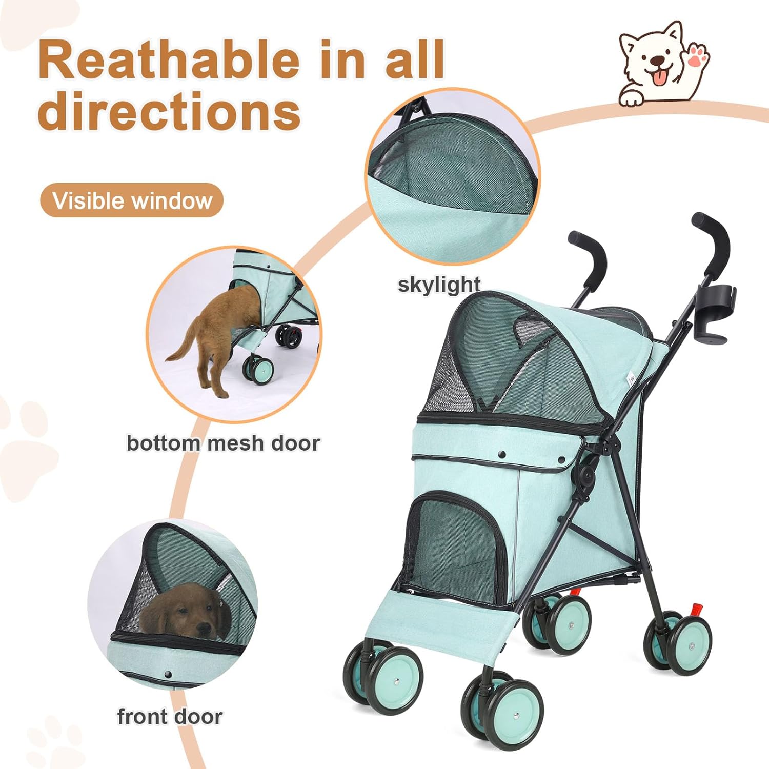 Umbrella Dog Stroller, 4 Wheels Pet Strolling, Foldable Carrier Pet Stroller for Small Dogs Cats, with Carrying Strap and Cup Holder, Dog Poop Bags & Dispenser, Up to 33 lbs, Cyan