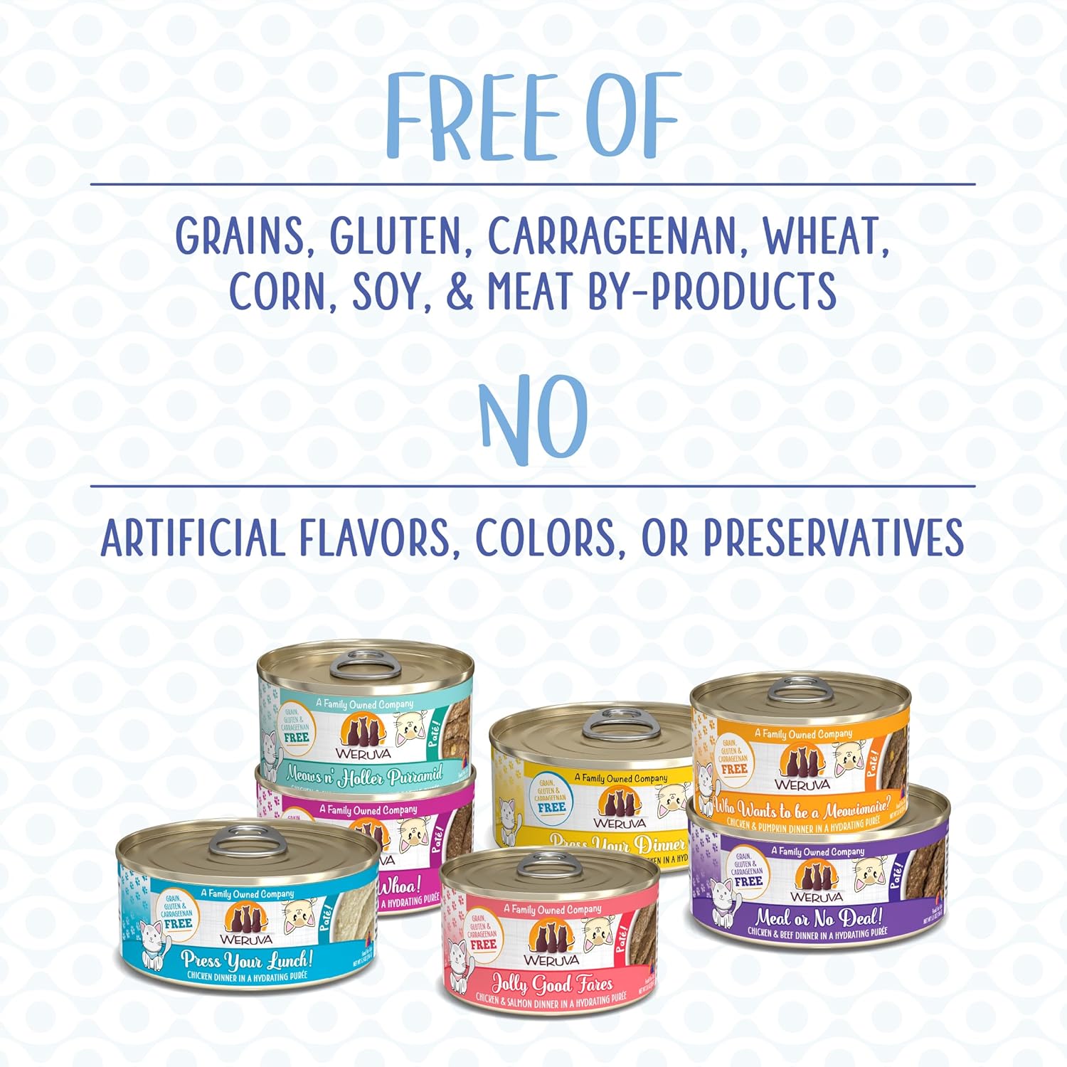 - All Natural. Free of grains, gluten, carrageenan, wheat, corn, and soy. No artificial colors, flavors, or preservatives