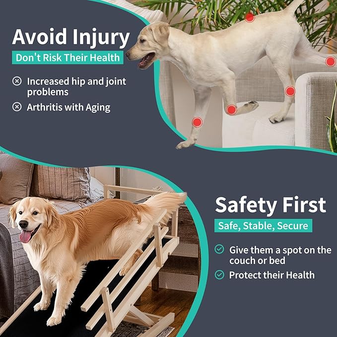 - STURDY & DURABLE: Our pet ramp for dogs and cats is specially made very well - solid wood construction and sturdy stainless steel fasteners, which has been tested to support up to 200lbs. When they jump off the bed, sofa, and sofa, there is no need to worry about getting injured, which provides safety for your pet.
