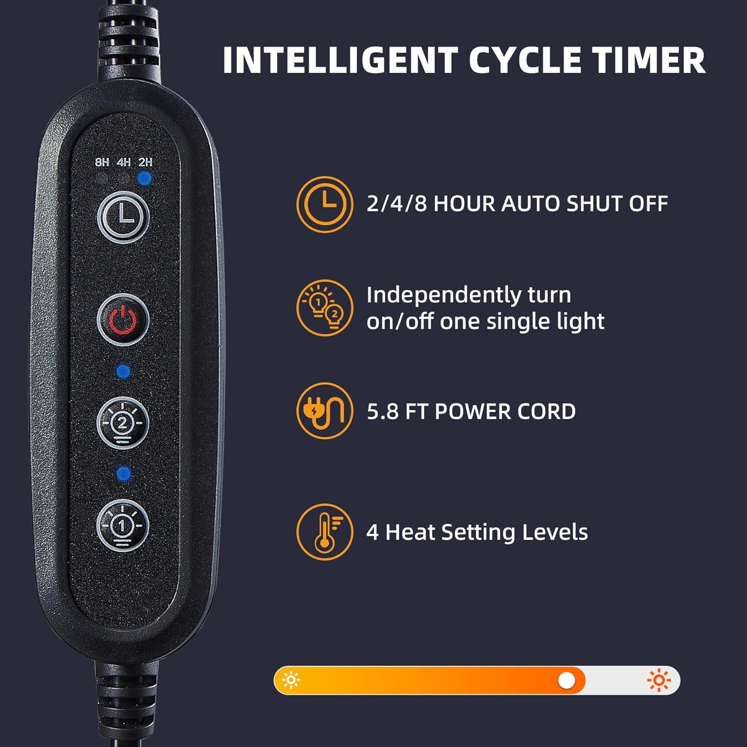 - Cycle Timer: The intelligent timer function of our reptile light allows you to set a specific time duration for the light to switch ON/OFF automatically. With options for 2, 4, or 8-hour cycles.