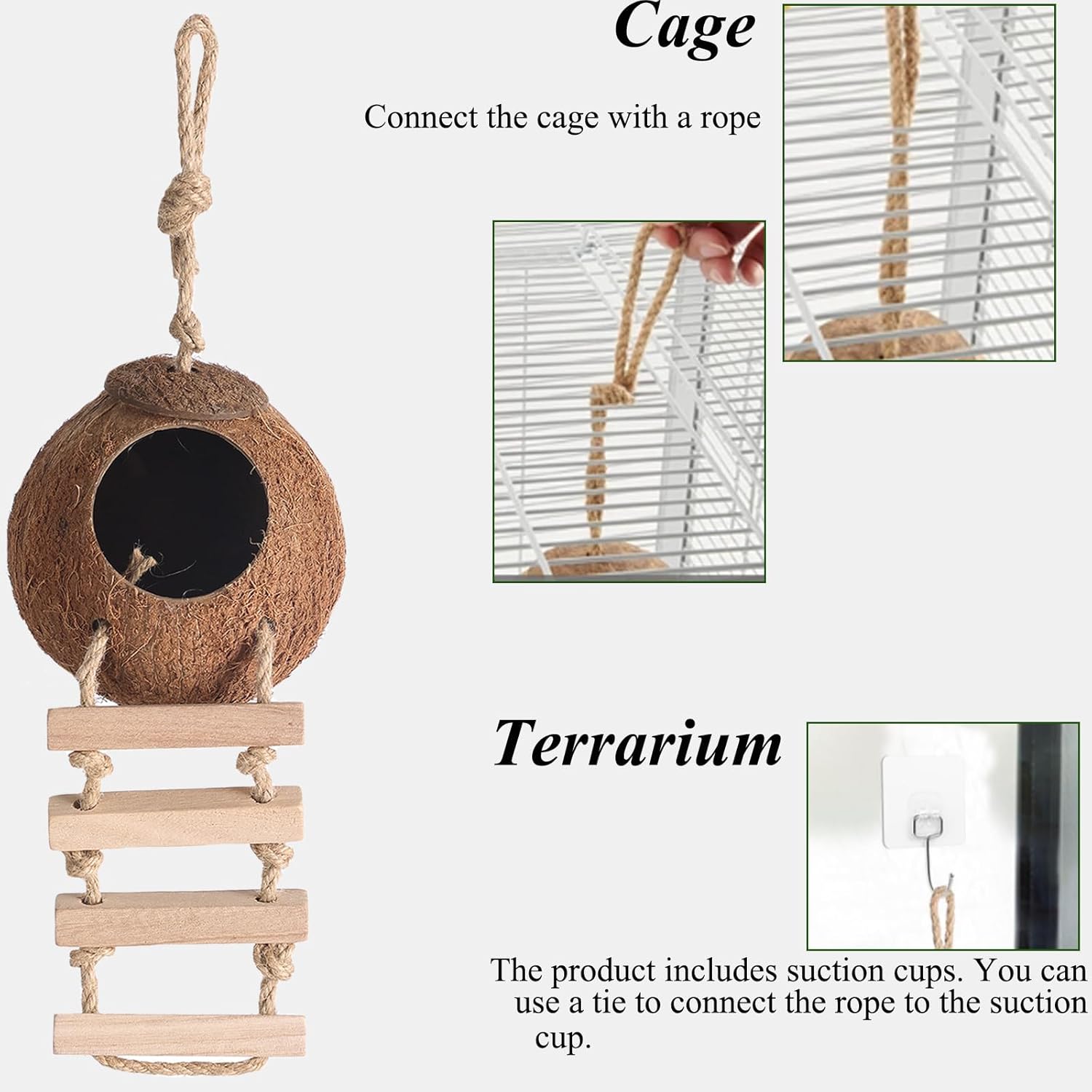- 【Package Include】1x coconut shell house, 1x suction cup; 1x coconut shell; The ladder is removable, you can remove it and use the coconut shell alone. Let's create a comfortable and challenging environment for your reptile.