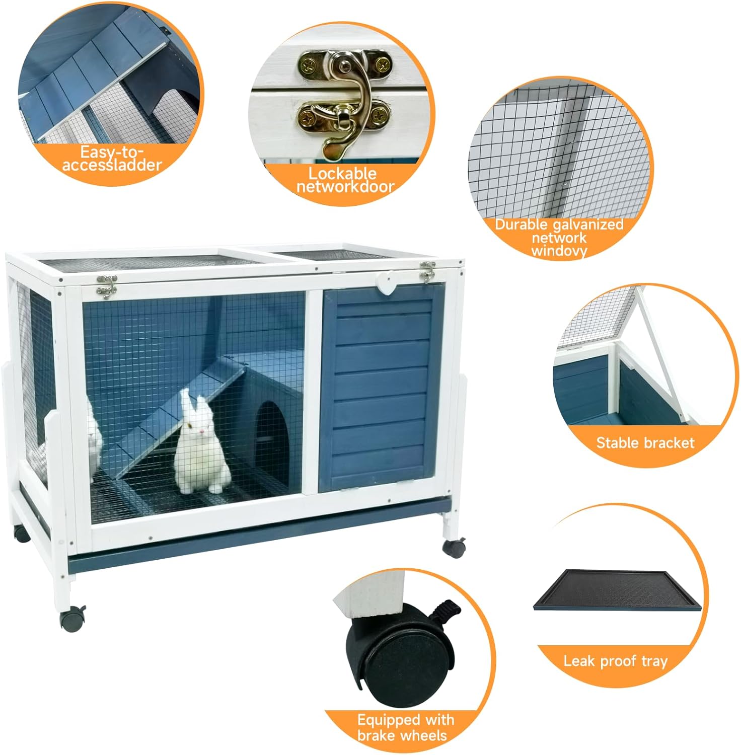 Two Floors Wooden Indoor Bunny Hutch Rabbit Cage on Wheels Guinea Pig PET House for Small to Medium Animals Waterproof No Leak Tray (M)