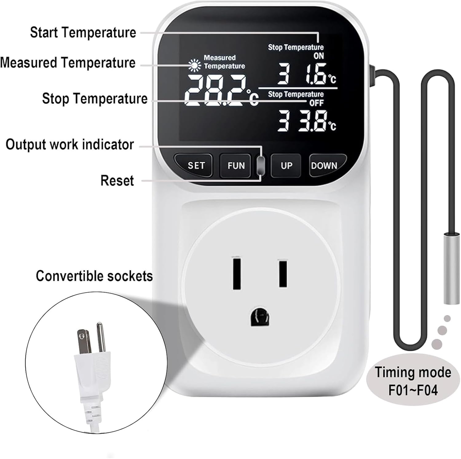 KABASI Digital Temperature Controller, Only Fahrenheit Dispaly Heavy Duty 15A Thermostat Outlet with Sensor, Heating Cooling Control Timer Plug Socket for Greenhouse Refrigerator Terrarium Aquarium