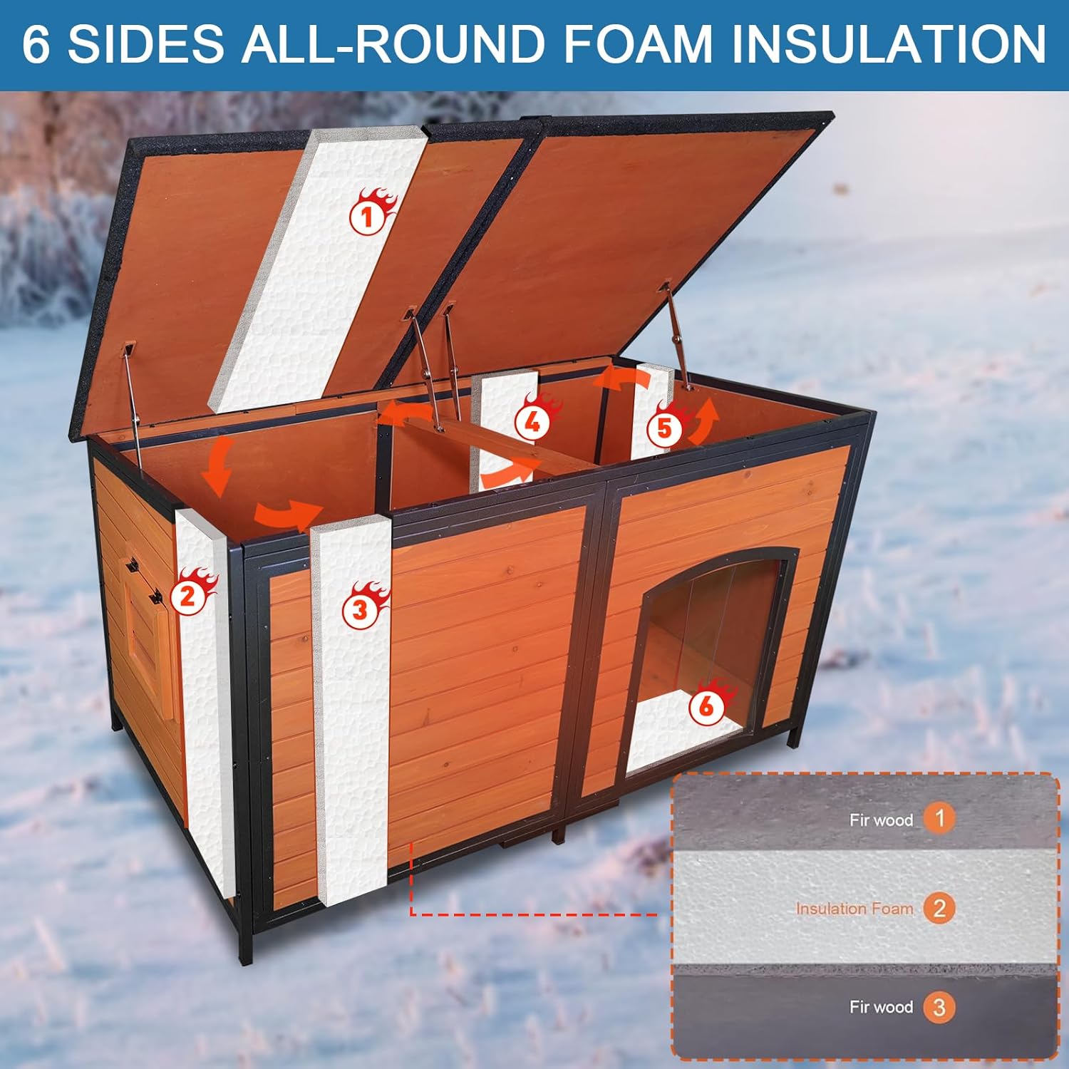 Extra Large Dog House Outdoor 59.1" L Outside Insulated Dog Kennel Weatherproof Winter, 6 Sides All-Round Foam for Small Medium Large Extra Large Dogs, Strong Metal Chew Proof Frame Window