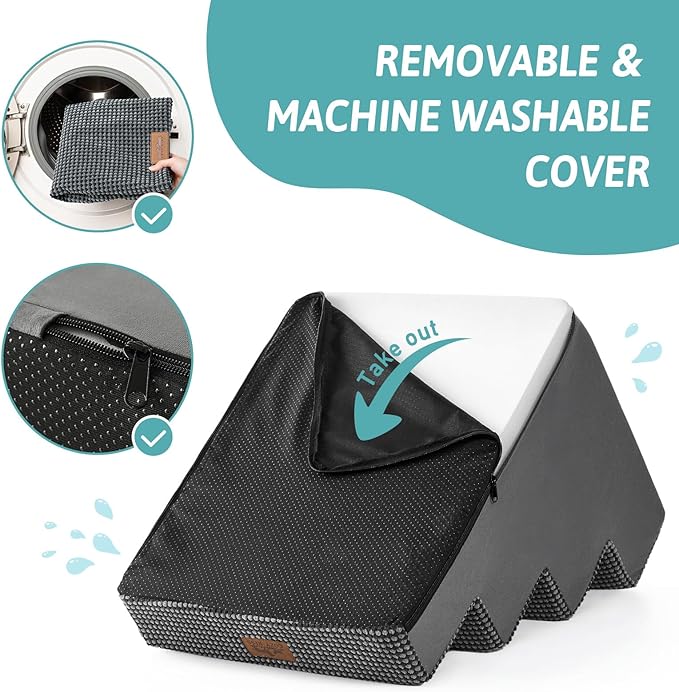 - Non-Slip Base and Removable Cover: Our dog steps for beds are equipped with a non-slip base featuring rubber dots for extra grip, minimizing movement during use. The pet steps cover is waterproof inner side, so you donβt have to worry about stains seeping into the foam. The outer cover is removable and machine washable for easy cleaning