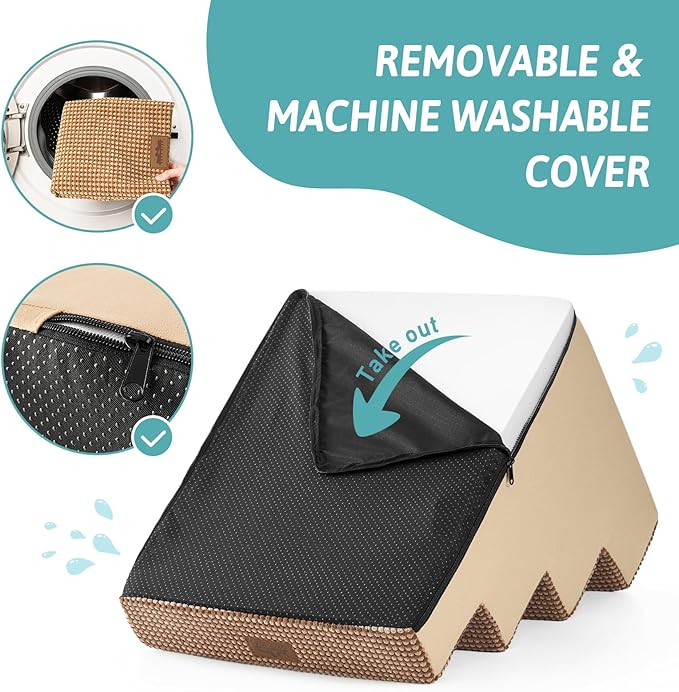 - Non-Slip Base and Removable Cover: Our dog steps for beds are equipped with a non-slip base featuring rubber dots for extra grip, minimizing movement during use. The pet steps cover is waterproof inner side, so you donβt have to worry about stains seeping into the foam. The outer cover is removable and machine washable for easy cleaning