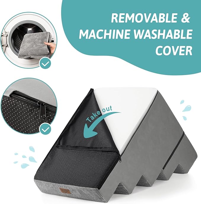 - Non-Slip Base and Removable Cover: Our dog steps for beds are equipped with a non-slip base featuring rubber dots for extra grip, minimizing movement during use. The pet steps cover is waterproof on the inner side, so you donβt have to worry about stains seeping into the foam. The outer cover is removable and machine washable for easy cleaning