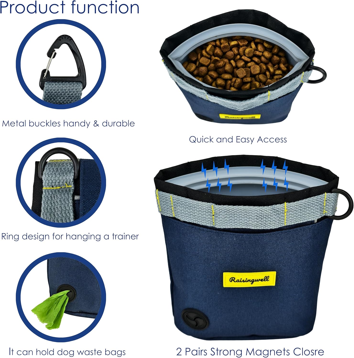 - 5.Durable Tech Material: Raisingwell's dog treat training pouch is made from durable, washable, and non-toxic fabric. Notably, its waterproof lining solves the problem of difficult-to-clean interiors of training bags, making it a great choice for your dog treat bag or dog treat fanny pack.