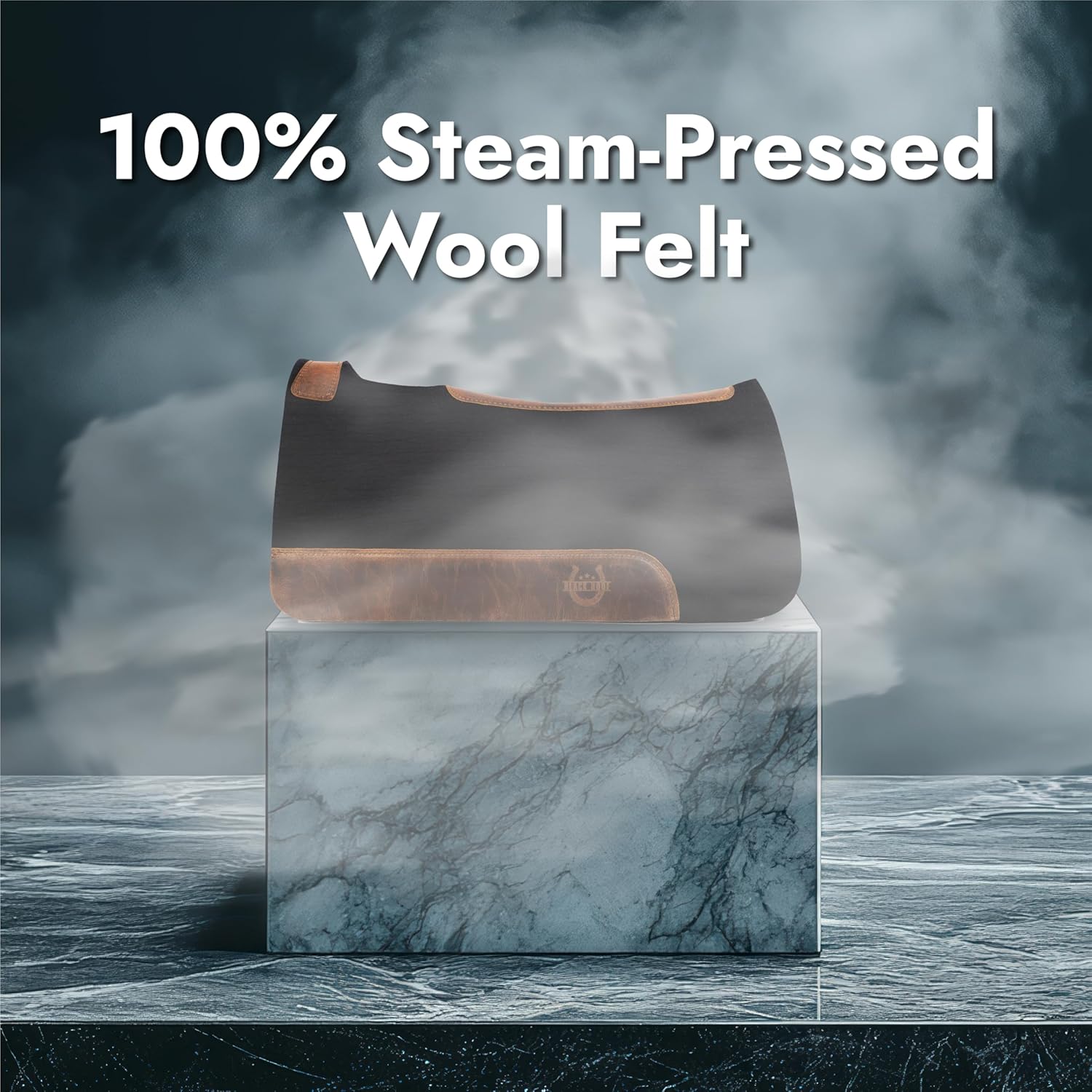 - PREMIUM MERINO WOOL FOR SUPERIOR COMFORT Crafted with 100% steam-pressed Merino wool felt, this saddle pad provides exceptional softness and cushioning. The high-quality wool minimizes pressure points and ensures your horse enjoys maximum comfort during every ride.