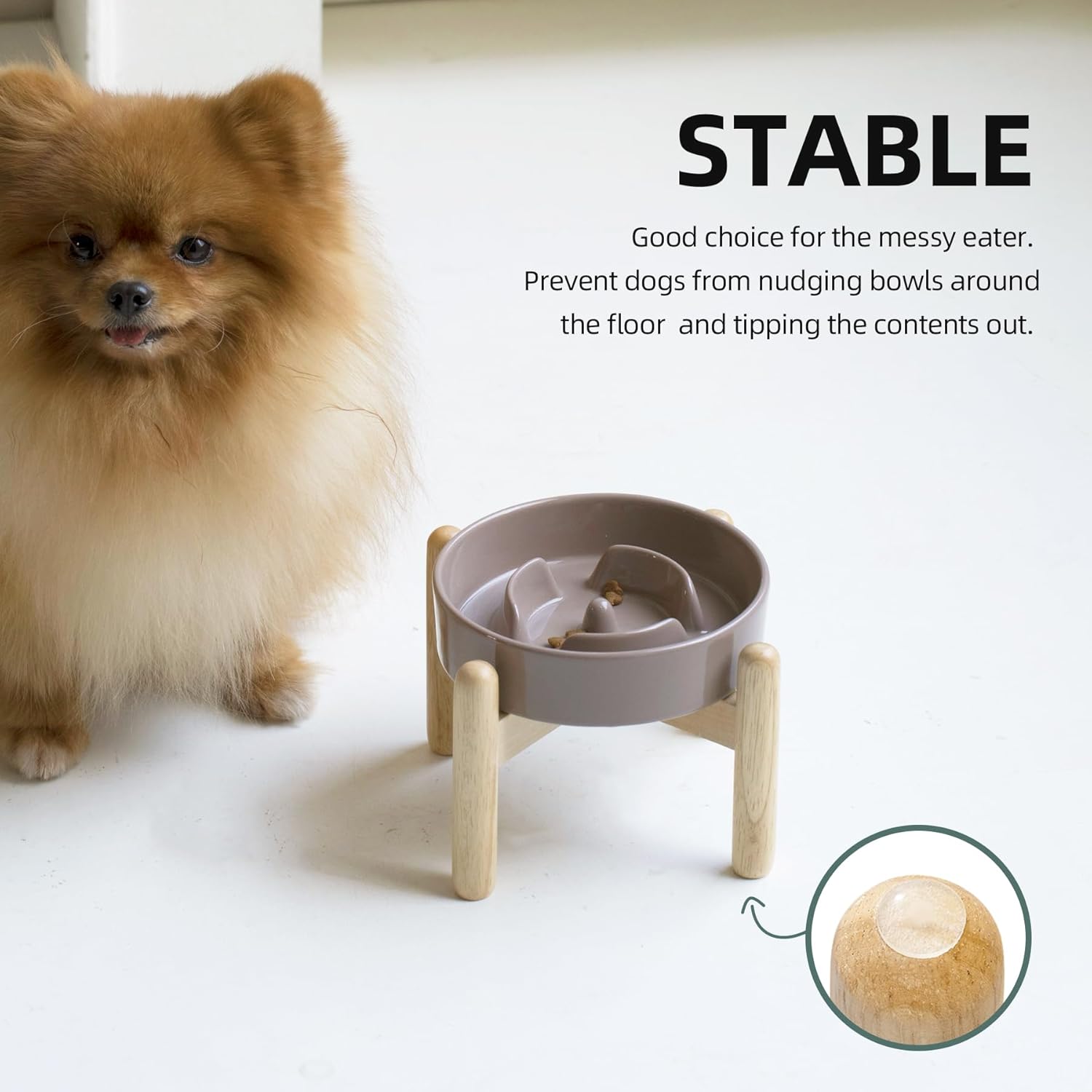 6.1inch Ceramic Raised Slow Feeder Set, Elevated Bowl with Wooden Stand for Small Dog and Cat, Puzzle Slow Dog Food Dish, Preventing Choking(Brown Coffee, Single Bowl+ Stand)