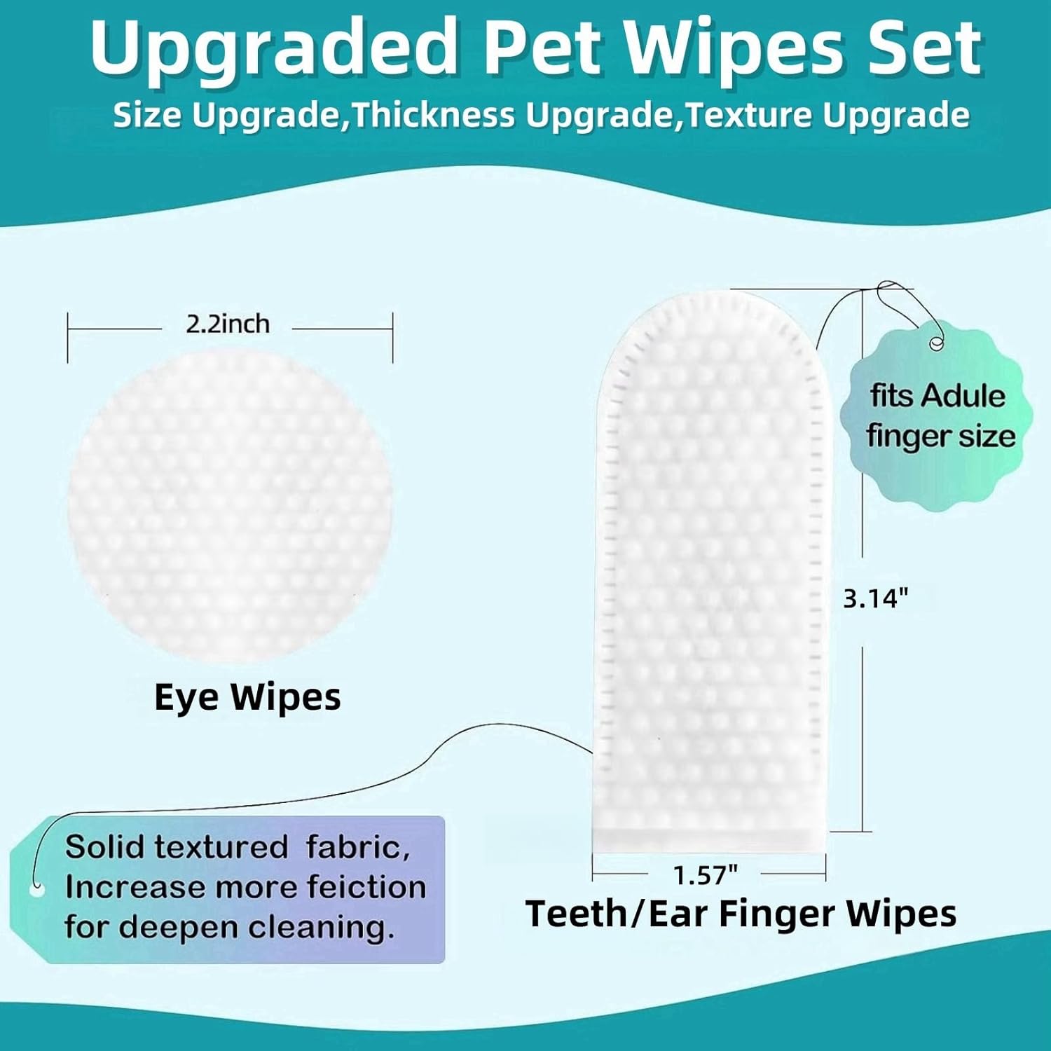 - 【Perfect Pet Wipes Set】Our no-rinse pet wipes set include 50 counts ear finger wipes,50 counts teeth finger wipes and 100 pcs eye wipes,which transform your pet grooming routine by effortlessly removing dirt,dander,tear stains and odors from your pet's ears teeth and eye,while soothing and nourishing pet's ear,teeth and eye.Perfect for daily use,outdoor activities,travel,and special circumstances,these wipes keep your pet clean,fresh-smelling.No rinsing is required,making grooming easier than ever.