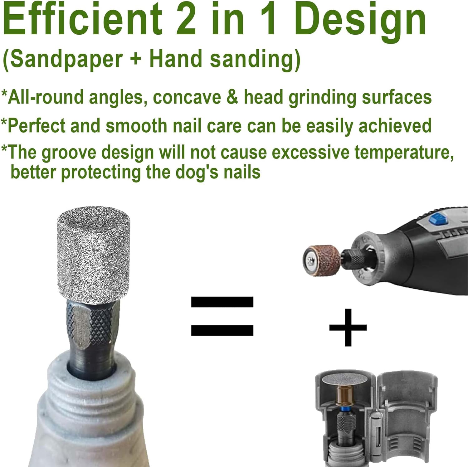 - The dog nail grinder attachment is very efficient, so there is no need to choose sandpaper and hand sanding. The side surface, concave surface and head surface of the grinding head can be used freely. Perfect and smooth nail care can be easily achieved.