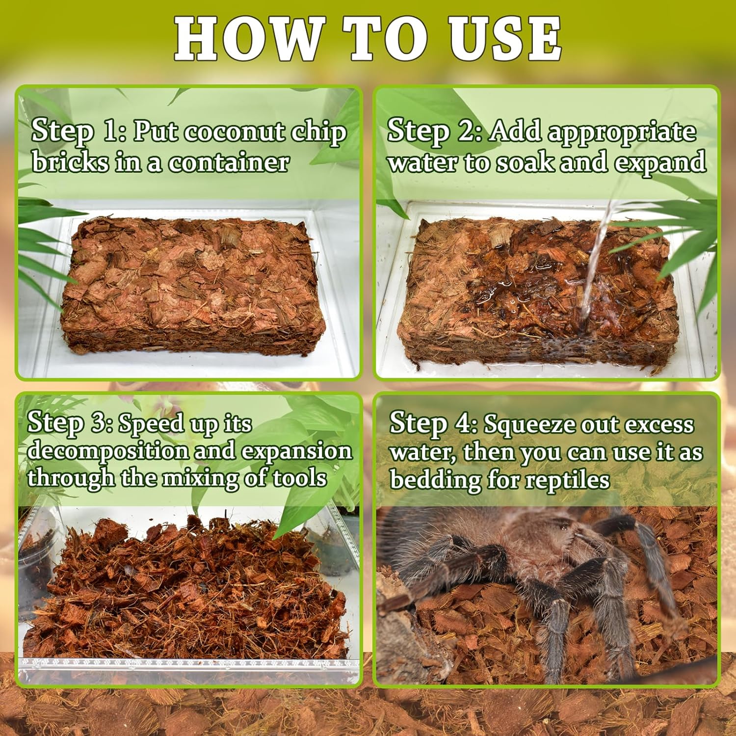 - What You Will Receive: You will get 1 PCS in 1.1 LB compressed coco coir chip brick. It will expand into loose coco chips after water absorption, each loose coco chips is about 10 mm ~ 35 mm, which is an ideal coconut substrate for reptiles